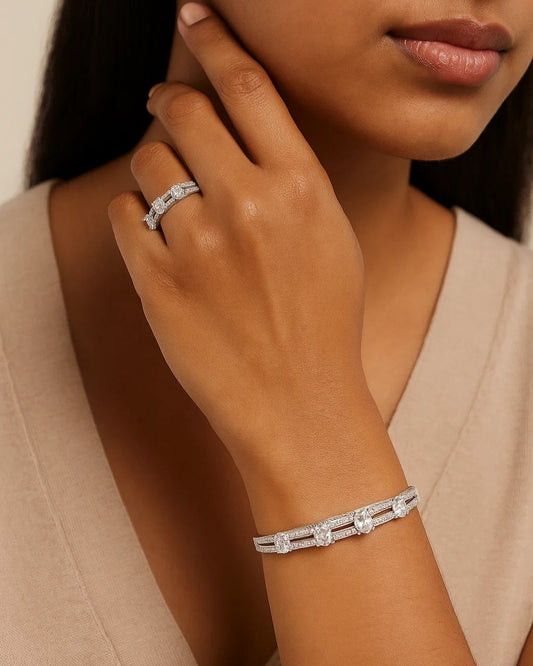 Adjustable Ring & Open Cuff Bracelet Combo with Oval-Cut Zircon Stones