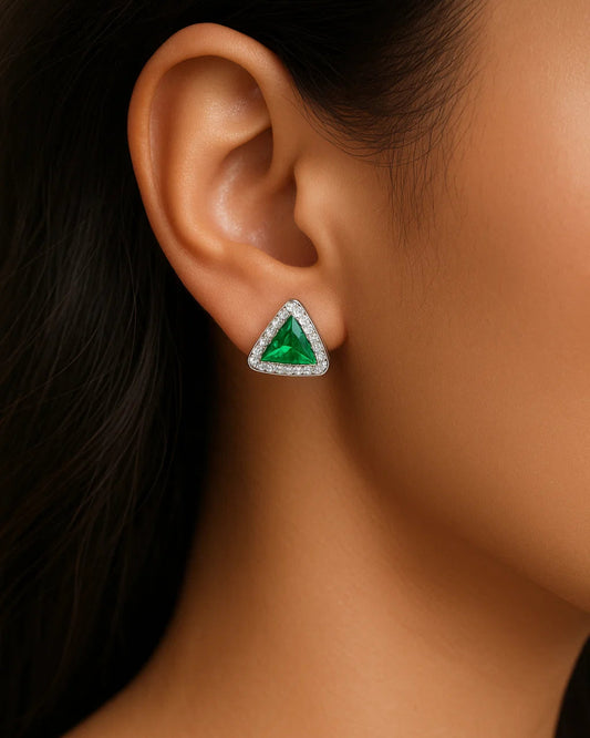 Trillion-Cut Emerald Stud Earrings with Diamond Halo for Women