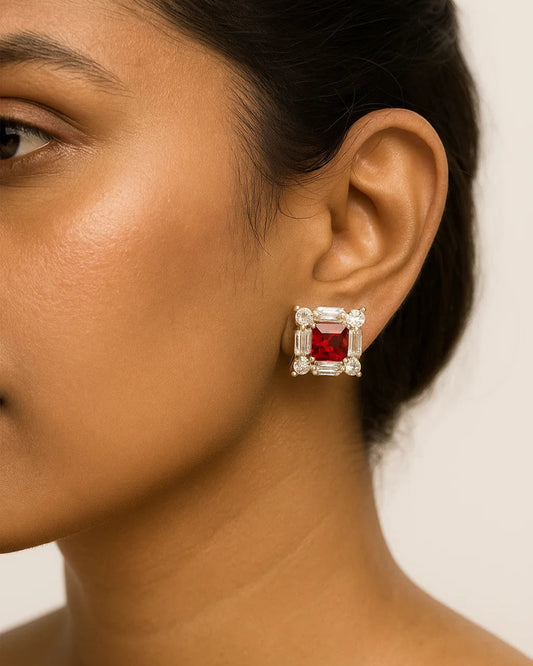Red Ruby Floral Halo Stud Earrings for Women