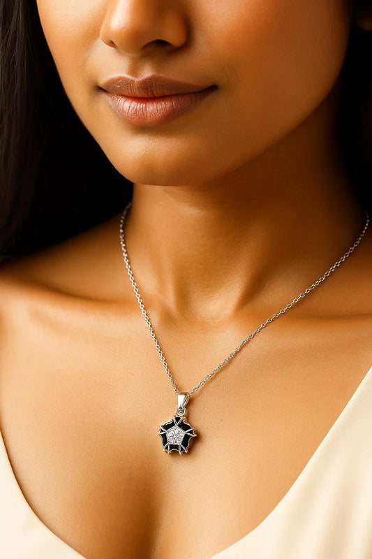 Sterling Silver Floral Star Pendant Necklace with Black Enamel & CZ Accents