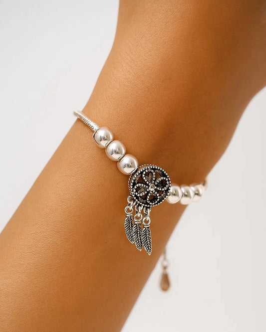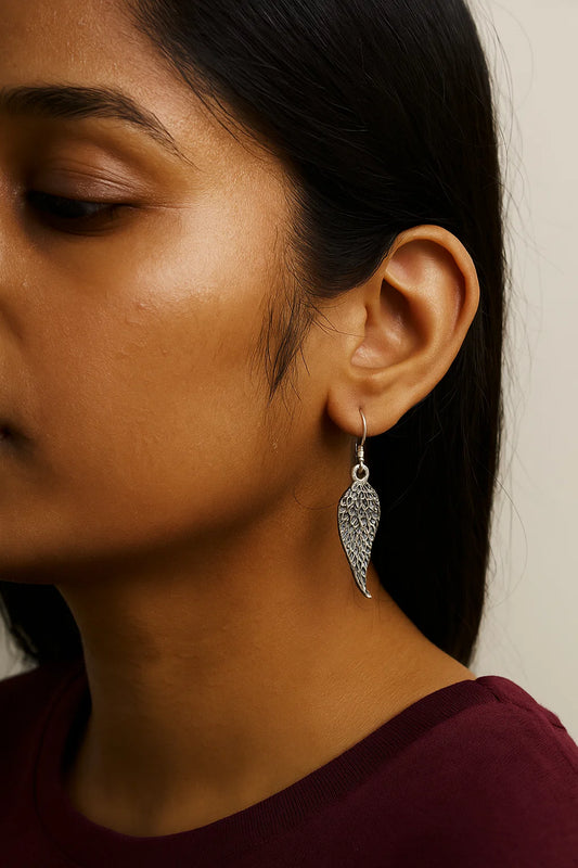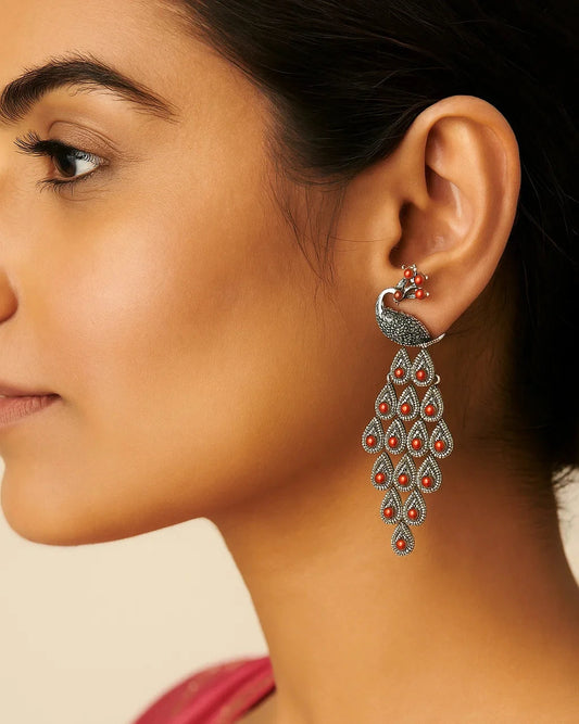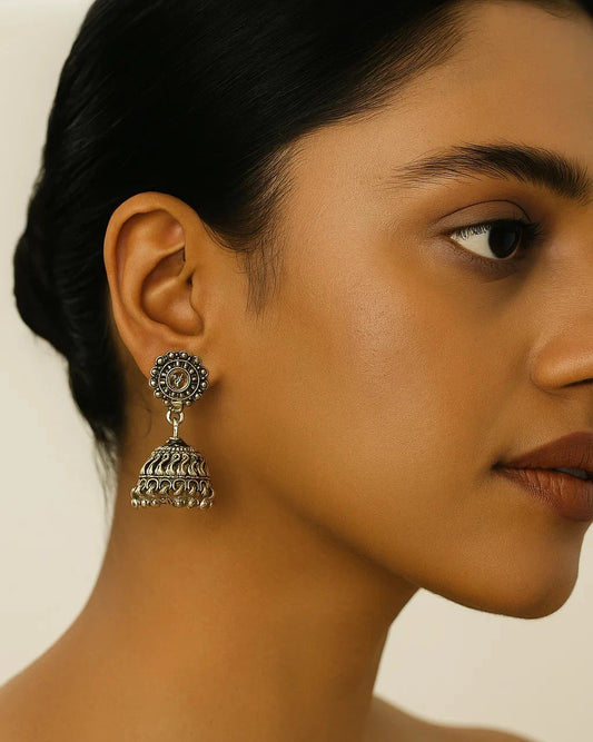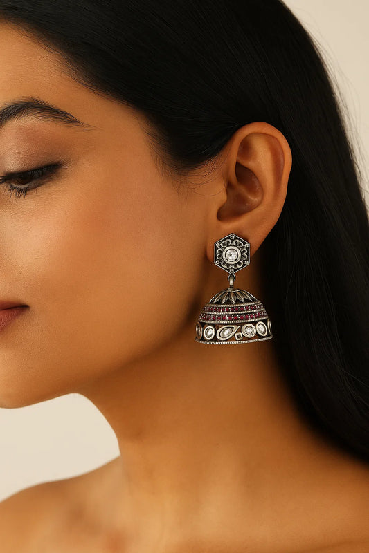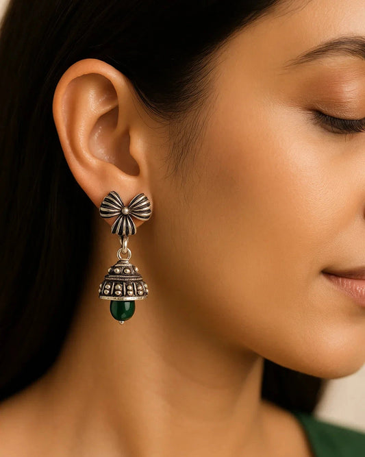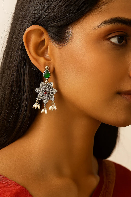 Silver Antique Floral Stud Earrings with Blue Stone & Pearl Drops