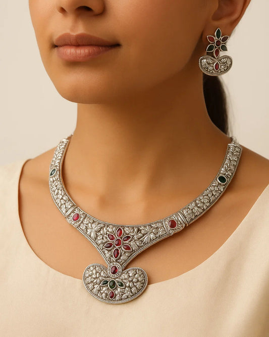 Antique Necklace Set with Earrings | Intricate Floral Design with Red & Green Stones