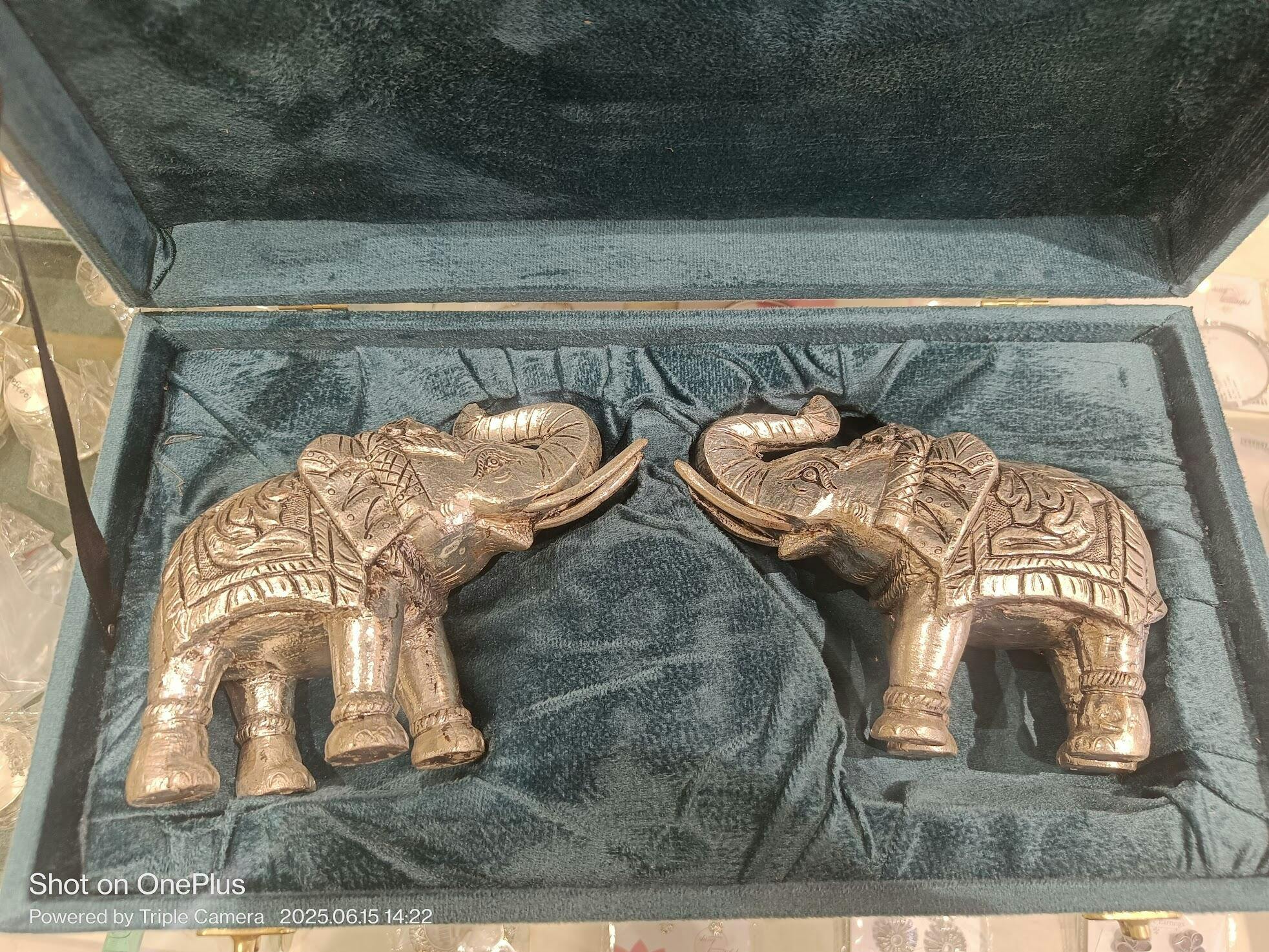 Add a touch of tradition and charm to your home with this exquisitely crafted silver-coated elephant pair mounted on sturdy wood. Hand-finished with intricate carvings, these elephants symbolize strength, wisdom, and good fortune. The blend of shimmering silver and natural wood makes it a timeless décor piece that complements any setting.